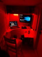Under-shelf red LED lights installed. Went with 12VDC lighting fixtures for RV use. Double lamp, 1st notch is red, 2nd notch brings up the white LED's. Future intention is to power everything with solar and a 12 VDC deep cycle battery